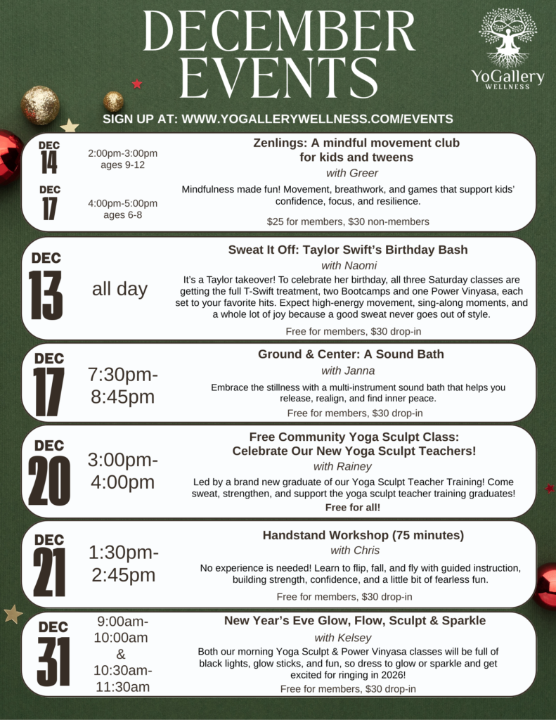Sign up for Zenlings age 9-12 Sign up for Zenlings age 6-8 Sign up for Taylor's Birthday Bash Sign up for Sound Bath Sign up for Free community sculpt class Sign up for handstand workshop Sign up for New Year's eve glow flow or sparkle sculpt