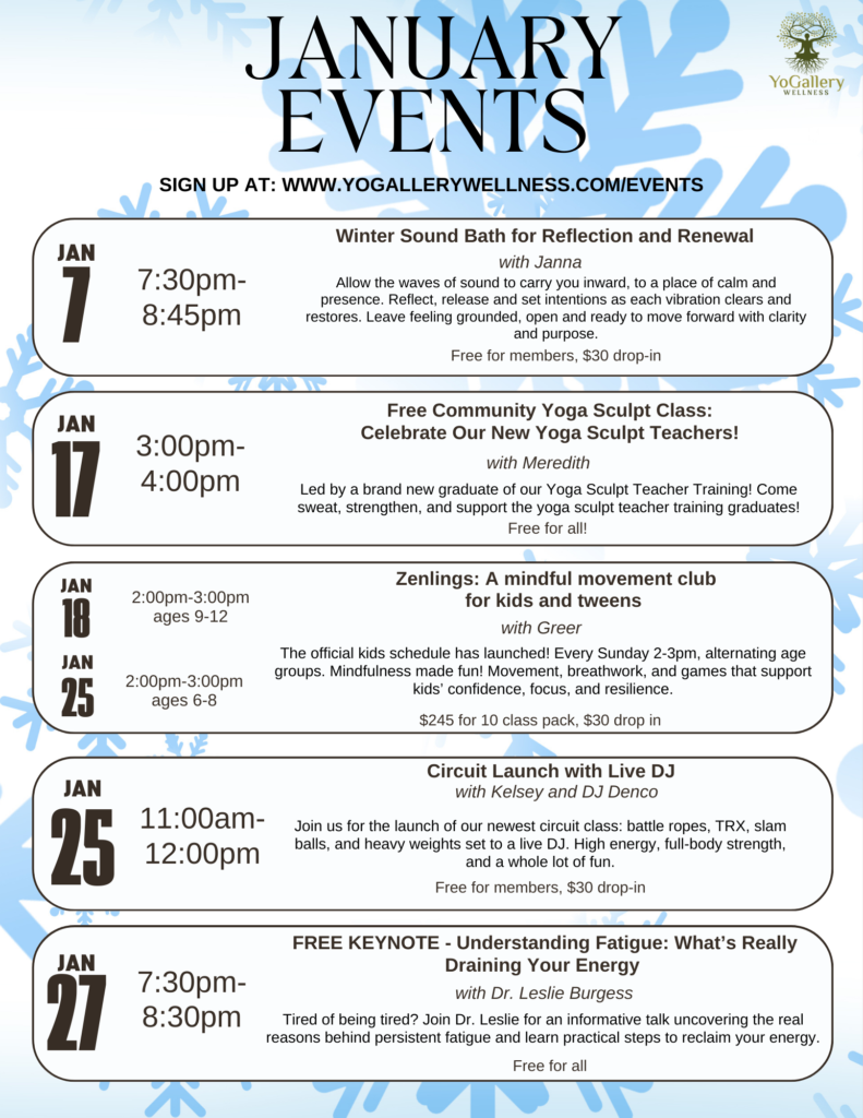 Sign up for Winter Sound Bath Sign up for Free community sculpt class Sign up for Zenlings Age 9-12 Sign up for Zenlings age 6-8 Sign up for circuit launch with live dj Sign up for Free Keynote: Understanding fatigue
