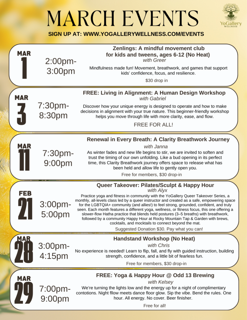 Sign up for Zenlings age 6-12 Sign up for Human Design Workshop Sign up for Clarity Breathwork Sign up for Queer Takeover: Pilates/Sculpt Sign up for Handstand workshop Sign up for yoga and happy hour at odd 13